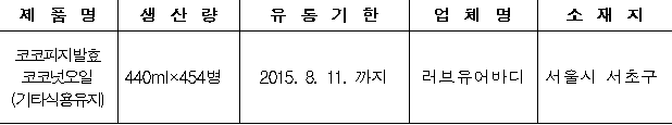 회수 대상은 유통기한이 2015년 8월 11일까지로 표시된 ‘코코피지 발효코코넛 오일’ 제품이며, 식품제조·가공업 등록 없이 정제 가공한 것으로 확인됐다는게 식약처의 설명이다.