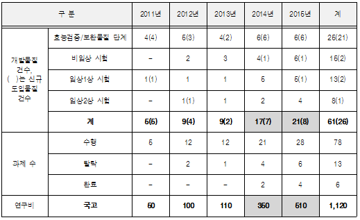 그러나 연구 사업단은 2014년 17건의 물질을 개발한다는 목표로 정부출연 연구비 350억원을 요구했다.