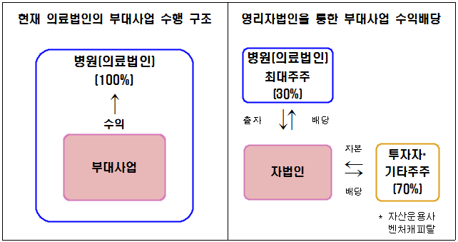 병원이 부대사업을 운영하는 경우에는 그 수익이 전부 의료법인으로 귀속되지만, 영리자법인을 설립하여 부대사업을 운영하면 영리자법인에 투자한 주주들에게 배당을 해야 하기 때문에, 병원의 부대사업 수익은 오히려 감소할 수 있어 흑자였던 병원이 적자로 전환되는 것이다.