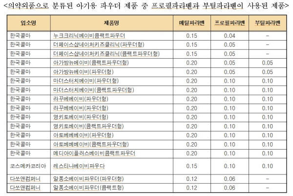 새정치민주연합 김용익 의원(국회 보건복지위원회)은 유럽연합(EU)이 내년부터 3세 이하 아기용 파우더에 프로필파라벤과 부틸파라벤 사용을 금지시키기로 한 가운데, 우리나라에서는 한국콜마(주)에서 생산되는 ‘아토베베 베이비’ 등 17개 아기용 파우더 제품(의약외품)에서 프로필파라벤과 부틸파라벤이 사용되고 있는 것으로 확인됐다고 7일 밝혔다.
