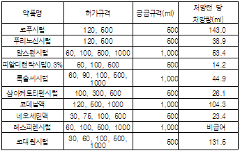 500ml, 1000ml 포장으로 공급되는 제품들의 처방전 한 장당 처방량은 10개 중 8개가 평균 100ml이 안 되는 것으로 나타났다.
