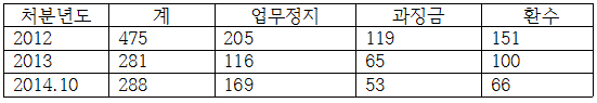 올해는 10월 기준으로 288개 기관이 처분됐으며 업무정지가 109개 기관, 과징금이 53개 기관, 환수처분은 66개 기관이다.