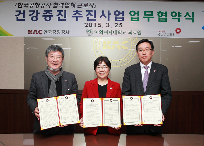 국민건강보험공단(이사장 성상철) 서울지역본부(본부장 임재룡)는 지난 25일 한국공항공사 및 이화여자대학교 의료원과‘한국공항공사 협력업체 근로자 맞춤형 건강증진사업’추진을 위한 업무협약(MOU)을 체결했다.