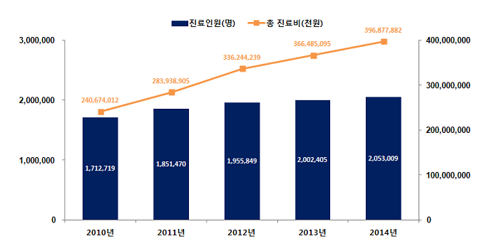 총진료비는 2010년 약 2,407억원에서 2014년 약 3,969억원으로 5년 전에 비해 약 1,562억원(64.9%)이 증가하여 연평균 증가율은 13.3%를 보였다.