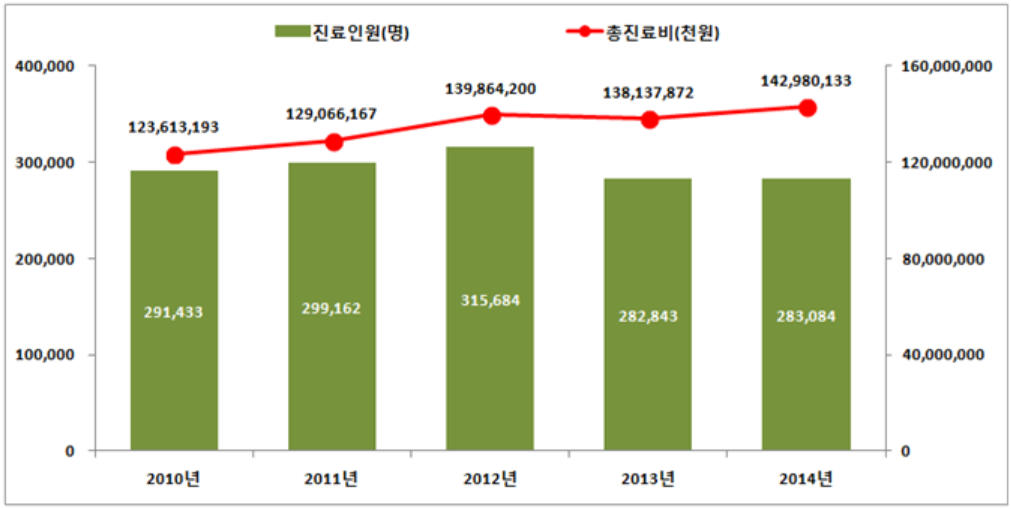 총진료비는 2010년 약 1,236억원에서 2014년 약 1,430억원으로 5년 전에 비해 약 194억원(15.7%)이 증가해 연평균 증가율은 3.7%를 보였다.