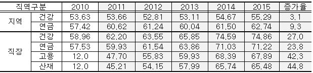 4대 사회보험료 통합징수가 시작된 2010년에 비해 직장은 건강보험과 국민연금이 27%와 23.8%, 지역은 3.1%와 9.3% 증가했다고 밝혔다.