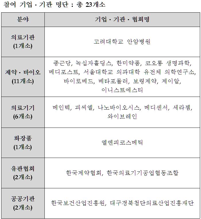 이 중 제약·바이오 분야 대표로 참석한 업체들은 종근당, 녹십자홀딩스, 한미약품, 코오롱 생명과학, 메디포스트, 서울대학교 의과대학 유전체 의학연구소, 바이로메드, 메타포뮬러, 보령제약, 제이알, 이니스트에스티 등 11곳이었다.