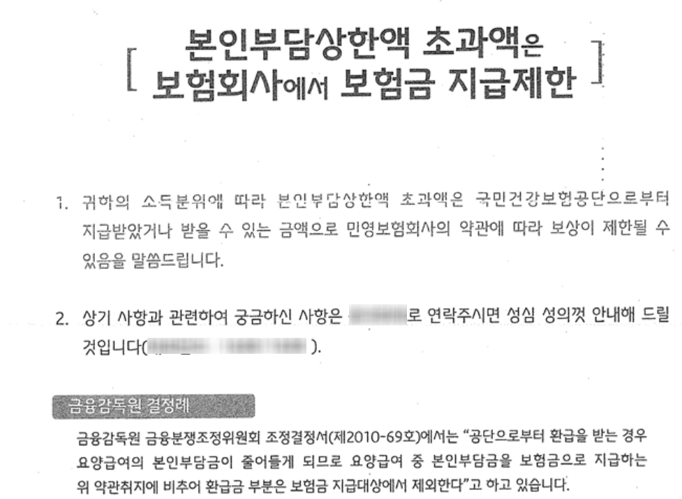 따라서 본인부담금 상한제 사후 환급금을 환자 본인부담금 경감으로 간주해 민간보험사에서 이를 공제하고, 지급하는 것 자체가 국민건강보험법 및 상한제 도입 취지 등을 고려할 때 타당하다고 볼 수 없다는 것이 건보공단의 해석이다.