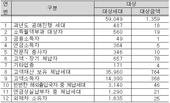 고액재산 보유자, 고액소득자, 외제차소유자, 외에도 빈번한 해외출입국자, 고액장기체납자 등 특별징수 대상기준을 12개 유형으로 확정하고, 이들을 대상으로 강제징수를 한층 강화할 방침이다.
