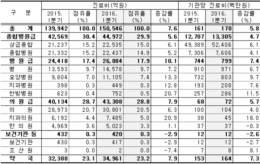 2016년 1분기 '건강보험 주요통계자료'에 따르면, 종합병원급 진료비 점유율이 줄고, 병원급 진료비 점유율은 증가한 것으로 나타났다.