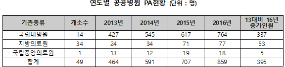 PA인력 증가현황을 보면, 국립대병원의 경우 2013년 427명이었던 PA가 2016년 764명으로 337명이 늘었다. 지방의료원도 2013년 24명에서 77명으로 53명이 늘었다. 국립중앙의료원도 13명에서 18명으로 늘었다.