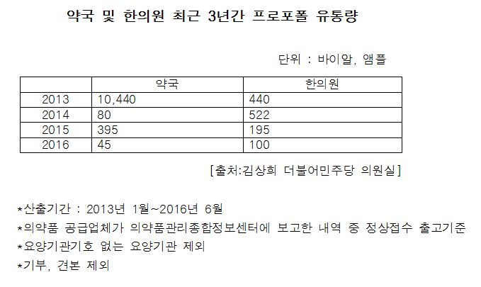 약업신문이 김상희 더불어민주당 의원실을 통해 입수한 '요양기관별 최근 3년간 프로포폴 유통량'을 확인한 결과, 일부 한의원과 약국에 향정신성의약품인 프로포폴이 유통되고 있는것이 확인됐다.