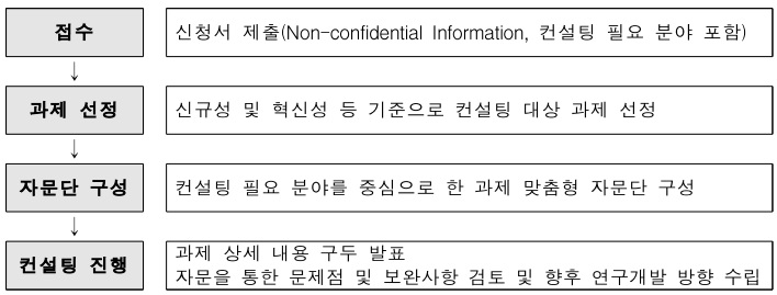 컨설팅 대상으로 선정된 과제 연구자는 자문위원단에게 연구내용에 대해 상세 발표 후, 자문위원단이 발표 내용과 사전에 제출된 신청서를 바탕으로 과제의 문제점과 보완사항을 검토해 향후 연구개발 방향‧계획 수립 등에 대한 컨설팅을 진행한다. 필요 시 서면평가서, 심층 면담 주선 등 서비스가 제공된다.