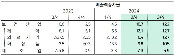 보산진에 따르면, 지난해 3/4분기 보건산업 제조업체의 매출액증가율은 12.2%로 직전 분기(10.7%) 대비 1.5%p 상승하며 2분기 연속 두 자릿수의 성장세를 이어갔다.