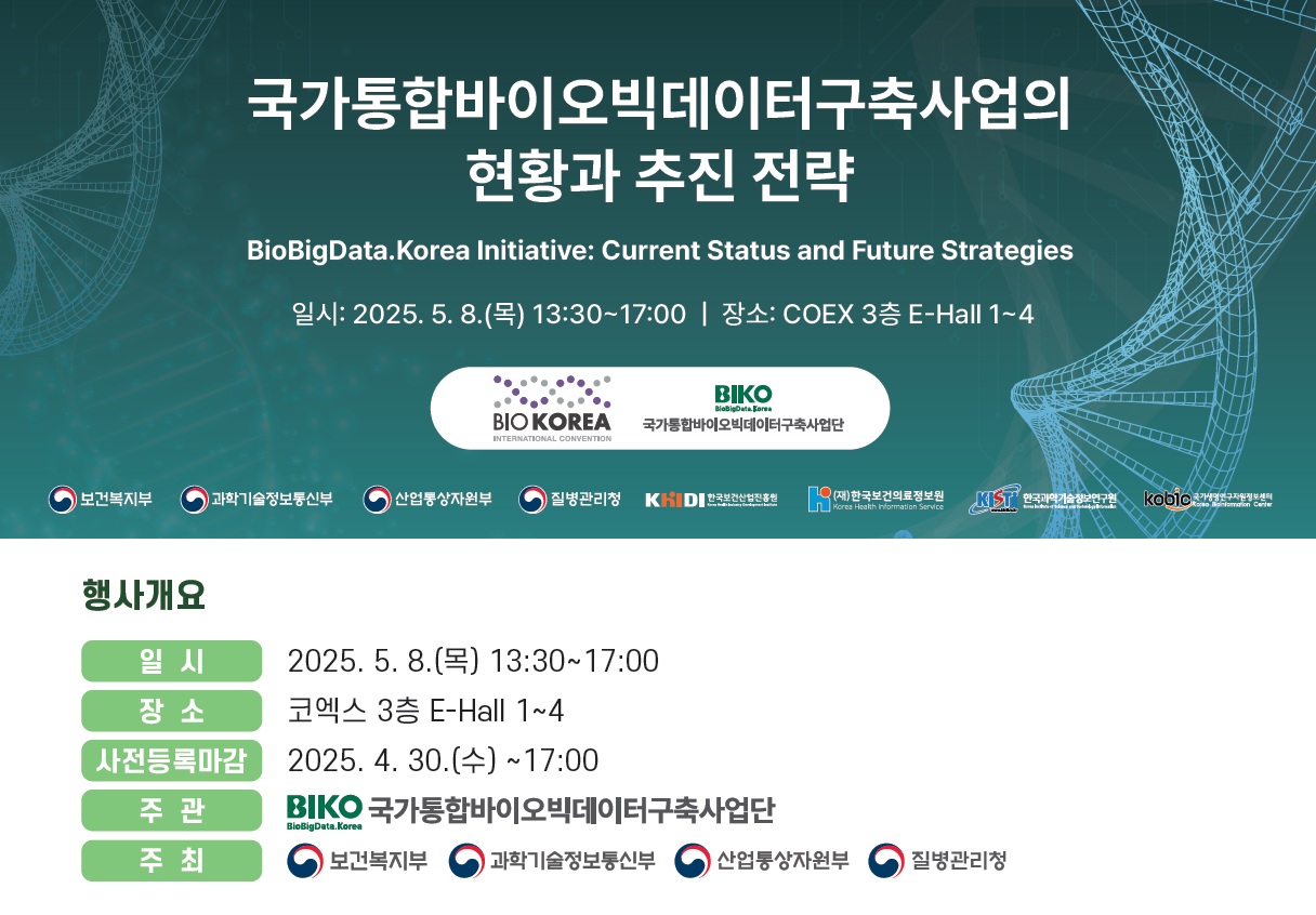 한국보건산업진흥원(원장 차순도) 국가통합바이오빅데이터구축사업단(단장 백롱민)은 바이오코리아 2025에서 ‘국가통합바이오빅데이터구축사업’ 홍보관과 콘퍼런스를 운영한다고 7일 밝혔다.