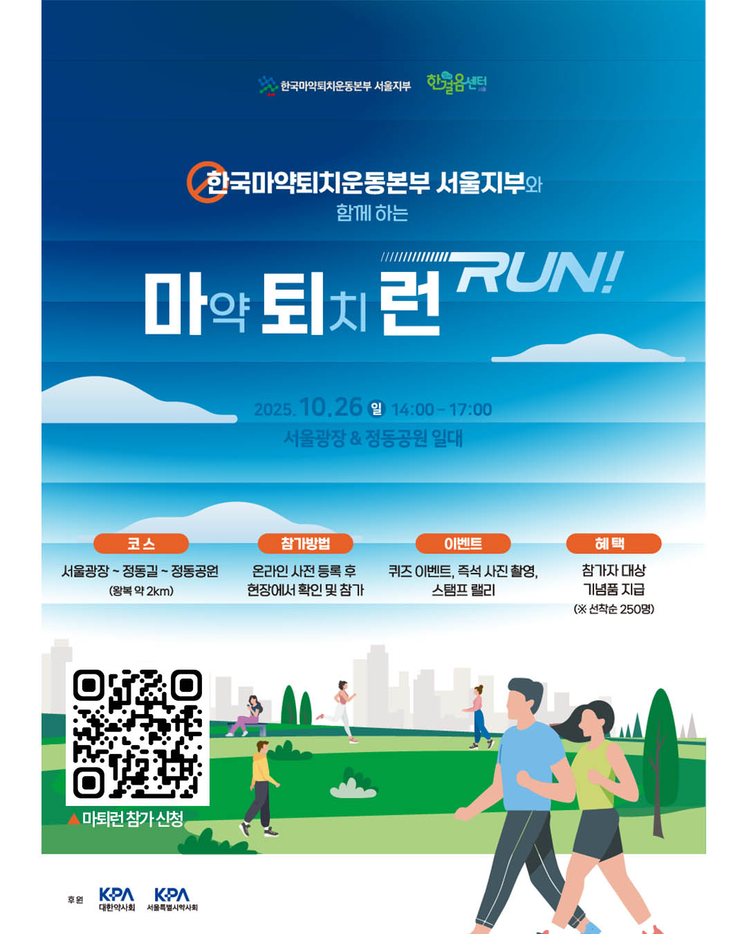 한국마약퇴치운동본부 서울지부서울함께한걸음센터(지부장 추연재)는 10월 26일 서울광장과 정동공원 일대에서 마약류 오남용의 위험성을 알리는 인식 개선 캠페인‘마퇴 런!’을 실시한다.