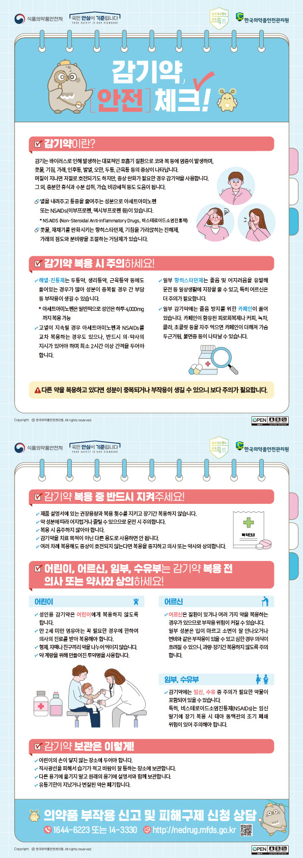 한국의약품안전관리원(원장 손수정, 이하 의약품안전원)은 감기약을 보다 안전하게 복용할 수 있도록 ‘감기약, [안전]체크!’ 안내문과 카드 뉴스를 제작했다고 31일 밝혔다.