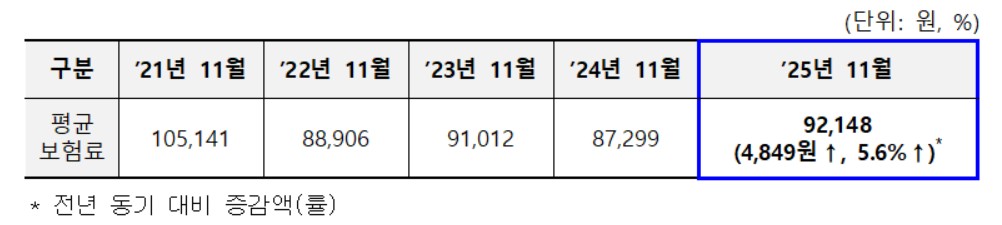2025년 11월 지역가입자 평균보험료는 92,148원으로, 전년 대비 4,849원(5.6%) 증가한 것으로 나타났다. 다만 최근 4년 평균인 93,090원과 비교하면 소폭 낮은 수준이다. 공단은 금융소득·사업소득 증가와 2025년 공시가격 상승에 따른 재산 과세표준 확대 등이 보험료 변동에 영향을 미친 것으로 분석했다.