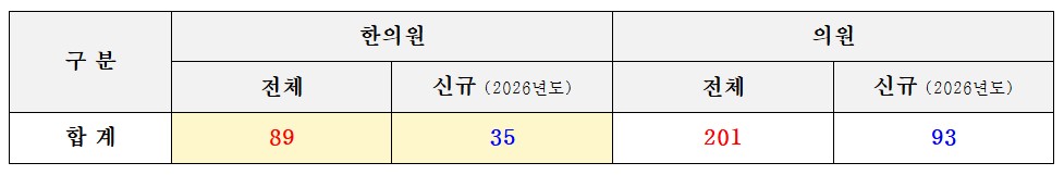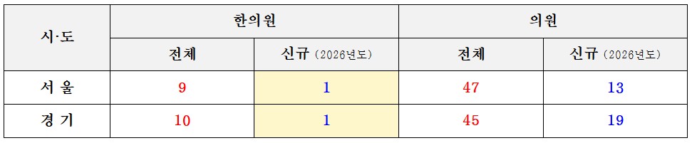 협회에 따르면, 작년 12월 발표된 2026년도 신규 및 전체 재택의료센터 지정 현황에서 한의원 시범기관 수는 양방 의원의 절반에도 미치지 못하는 것으로 나타났다. 특히 2026년도 신규 공모 결과를 보면, 양방 의원은 수도권에서 서울 13개소, 경기 19개소가 선정된 반면, 한의원은 서울과 경기 각각 1개소에 그쳤다.