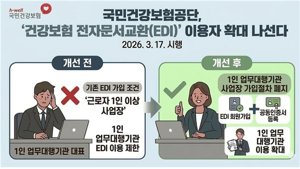 국민건강보험공단(이사장 정기석)이 건강보험 전자문서교환(EDI) 이용 대상을 확대해 1인 업무대행기관도 건강보험 신고 업무를 수행할 수 있도록 시스템을 개선하고, 17일부터 서비스를 시행한다.