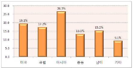 조사에 참여한 38개 기업 중 35개 기업(92.1%)이 ‘해외시장에 진출한 경험이 있다’는 것으로 응답했으며 현재 해외시장에 진출한 기업 중 가장 많이 진출한 국가는 ‘아시아’(36.8%)가 가장 높고, ‘중동’(17.2%), ‘남미’(16.1%) 순으로 나타났다.