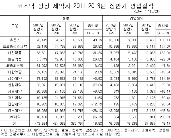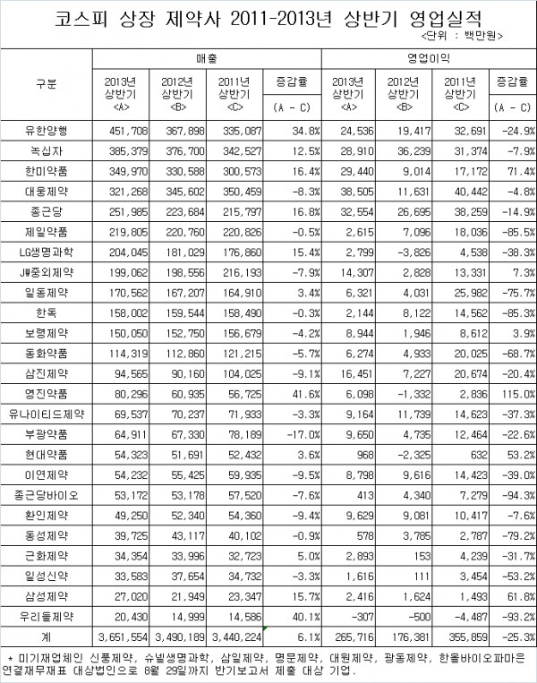 약업닷컴(www.yakup.com)이 8월 20일 현재 금융감독원에 2013년 상반기 영업실적을 보고한 상장 제약업체들을 대상으로 올 상반기와 2011년 상반기 실적을 분석한 결과 이들 업체들의 매출은 2년간 7.2% 성장하는데 그쳤다.