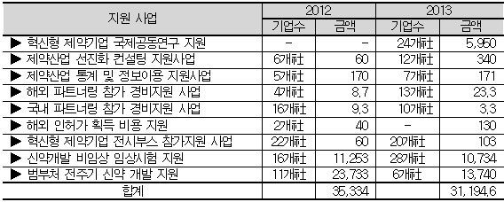 2013년에는 △혁신형 제약기업 국제공동연구 지원에 24개사 59억5,000만원 △범부처 전주기 신약 개발 지원에 6개사 총 137억4,000만원 △신약개발 비임상 임상시험 지원에 107억3,400만원 △제약산업 선진화 컨설팅 지원사업에 12개사 3억4,000만원 등 총 311억9,500만원이 직접 지원됐다.