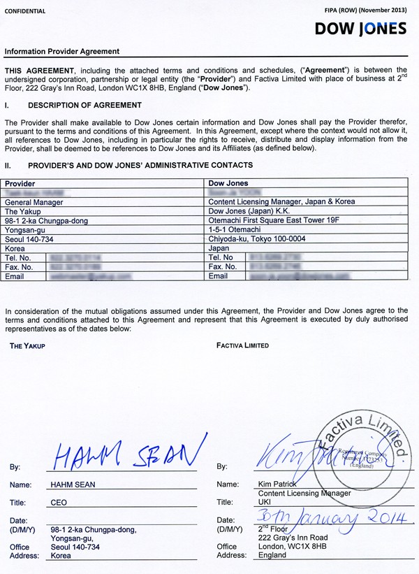 약업신문(대표 함성원)은 최근 다우존스그룹이 운영하는 팩티바리미티드(Factiva Limited)와 뉴스공급과 관련된 포괄적 협력관계 계약을 체결했다. 양사는 각사 대표가 서명한 최종계약서를 상호 교환했다.