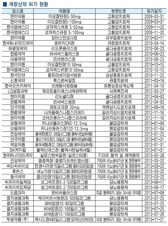 현재 2013년 말 현재 개량신약으로 허가받은 품목은 39품목에 이르고 있다. 국내 제약기업이 개발한 개량신약은 국내 처방 의약품 시장에서 다국적 제약사들의 아성을 위협하는 품목으로 인식되고 있다.