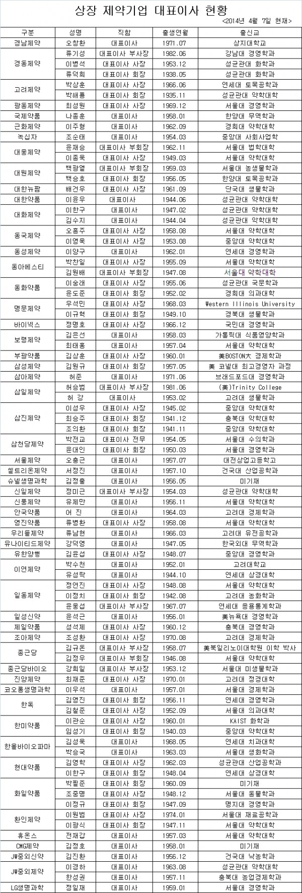 상장제약 제약회사 대표이사 81명중 서울대 출신이 23명으로 가장 많고 그 뒤를 성균관대 출신은 10명, 고려대와 연세대가 각각 7명, 중앙대가 각각 6명 등이었다.