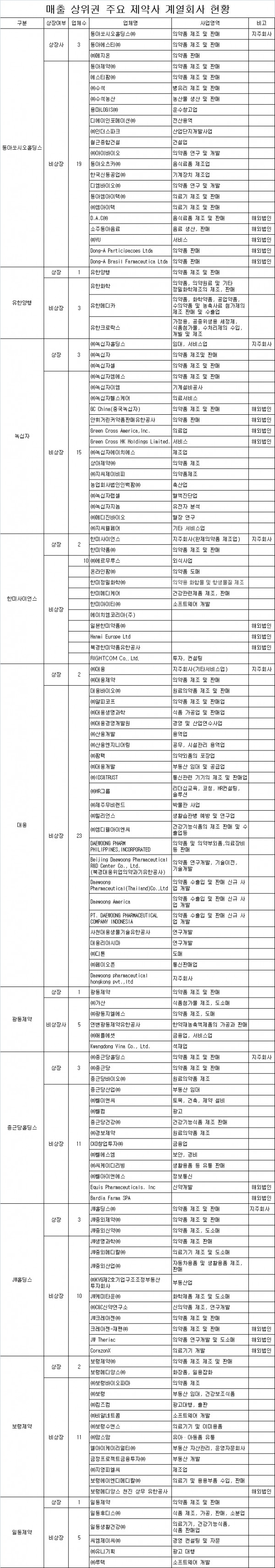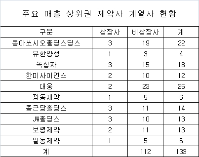 상장제약사중 가장 많은 계열사를 거느리고 있는 업체는 대웅으로 상장사 2곳과 비상장 23개 등 총 25개사가 계열사로 속해 있다.