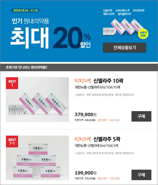 ‘가격파괴 이벤트’ 대상이 되는 품목들은 요즘 각광받고 있는 미백주사나 영양주사제들로, 대한뉴팜의 신델라주, 비타민씨주, 대한약품공업의 뉴트리헥스, 새로나민주 등이다. 이들 인기 주사제들을 5곽, 10곽 등의 단위로 구매할 경우 큰 할인혜택을 볼 수 있다. 특히 자주 사용되는 주사제를 한데 묶어 싸게 파는 패키지 판매도 있어 더욱 실용적이다.