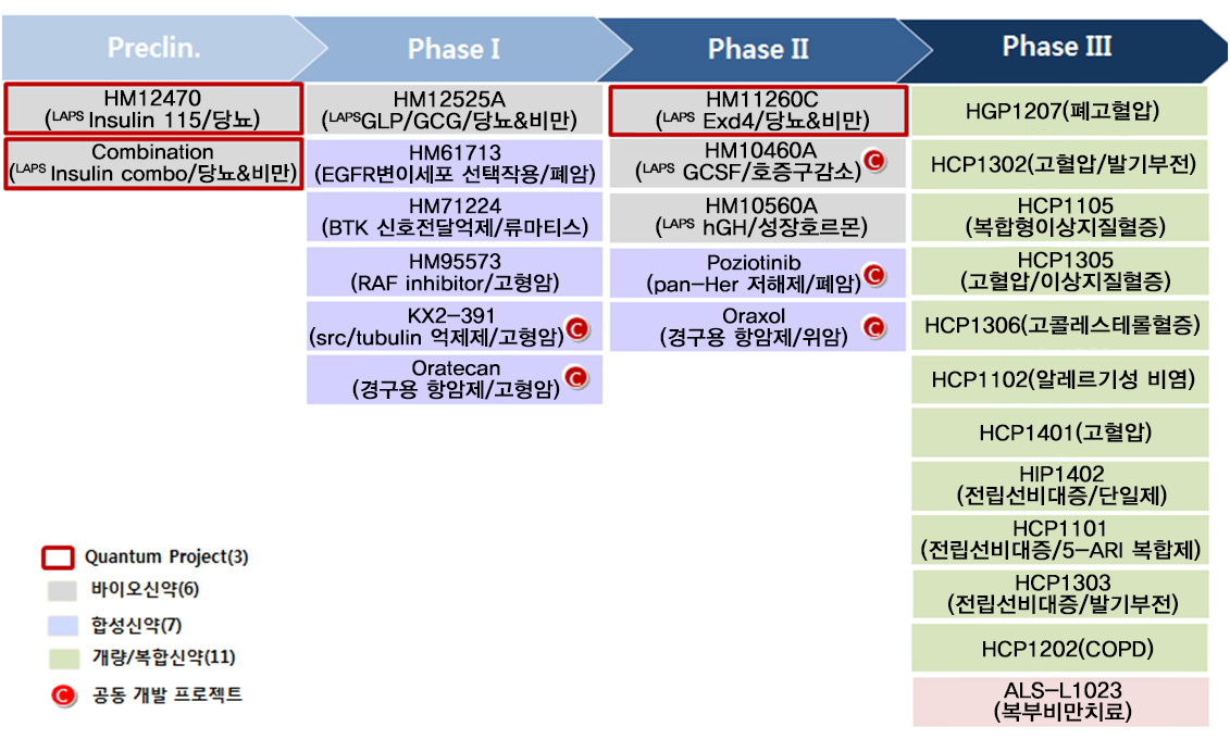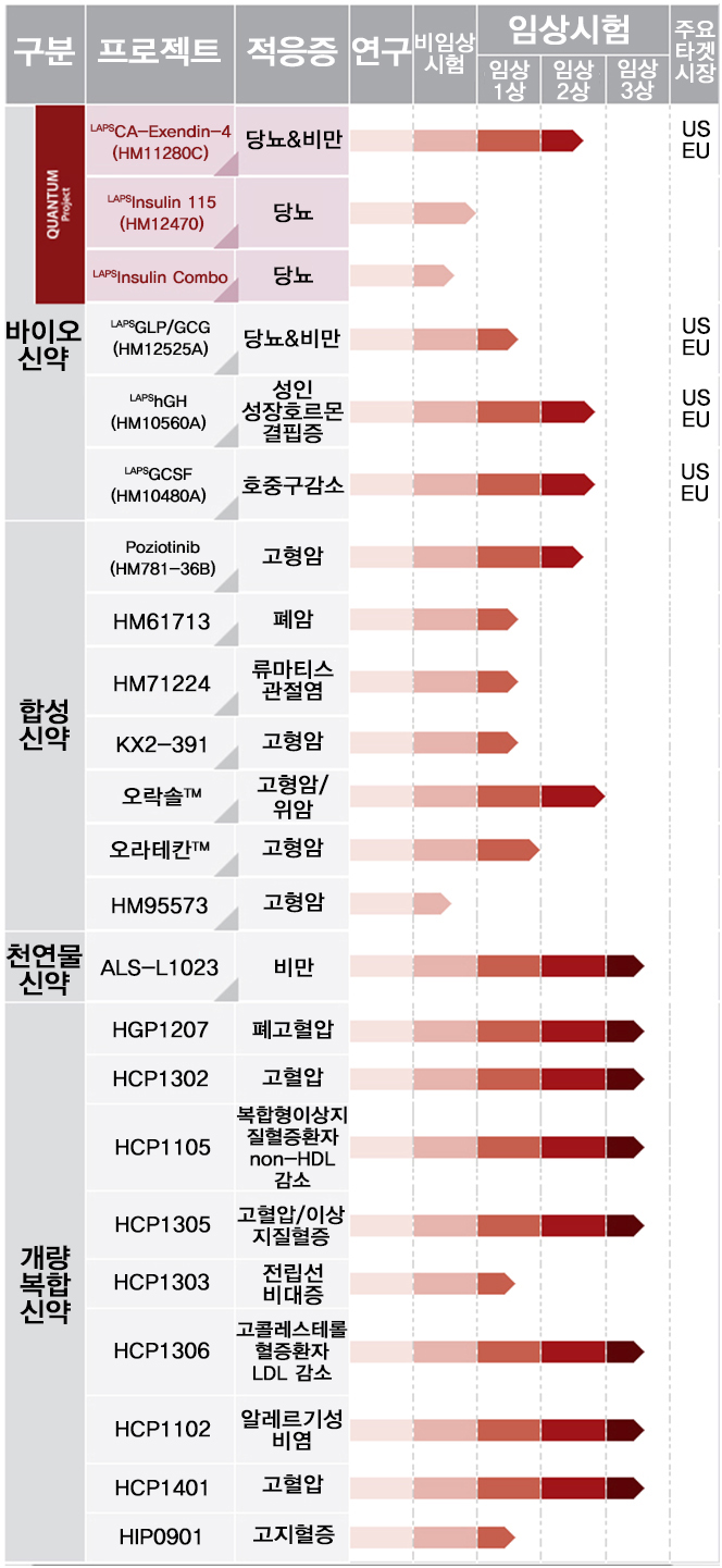 대표적으로, 세계 최초 월 1회 투약을 목표로 개발 중인 당뇨병치료제 LAPSCA-Exendin-4는 미국 및 유럽 임상 2상을 마쳤으며, 최근 미국, 유럽 한국 등 10여개 국가에서 후기2상 임상에 돌입했다.