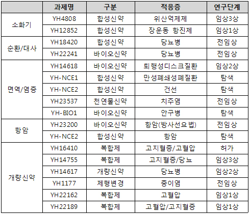 현재 17개 신약연구 과제를 진행 중으로, 올해에도 초기 기반기술부터 임상분야까지 폭넓은 외부 협력을 통해 신약 파이프라인을 확대할 계획.