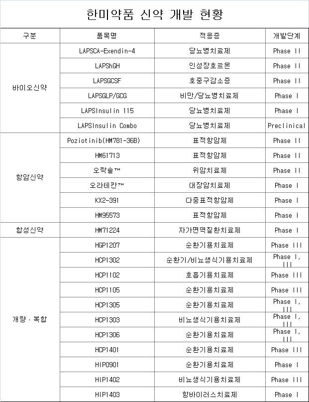 한편, 한미약품은 바이오신약, 항암신약, 합성신약, 개량·복합신약 등 다양한 부분의 신약 파이프라인을 보유하고 있다.