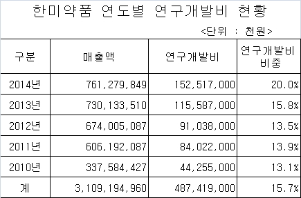 약업닷컴(www.yakup.com)이 한미약품의 사업보고서를 분석한 결과, 2014년 매출액의 20%인 1,525억원을 연구개발비로 투자하는 등 2010년부터 5,000억원이 넘는 금액을 연구개발비로 지출했다.