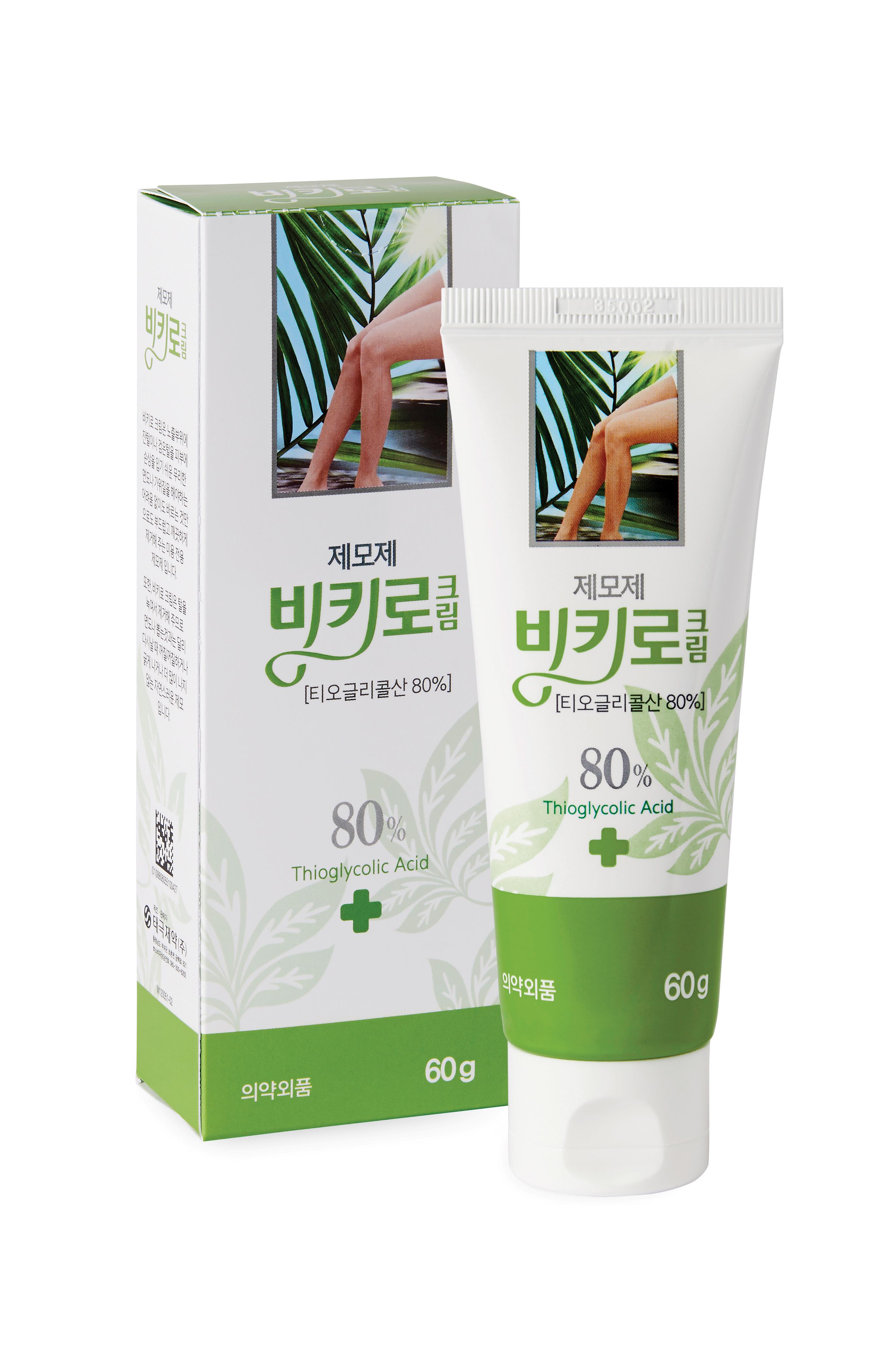 손쉬운 제모를 도와주는 ‘비키로크림 60g’은 피부에 도포 후 닦거나 씻어내는 사용법을 통해 자극 없는 제모를 도와주는 제품이다. 주성분인 ‘치오글리콜산 80%(Thioglycolic Acid 80%)’은 털의 모근부위를 부드럽게 녹여 체모를 효과적으로 제거해주며, 털이 다시 날 때 꺼칠꺼칠하거나 굵게 나지 않도록 도와준다.