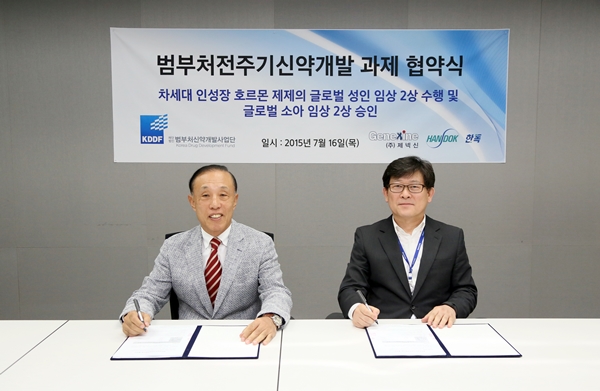 ‘GX-H9’은 범부처신약개발사업단의 제1호 지원과제였던비임상 시험이 성공적으로마무리 된후 2012년에 한독으로 기술이전 됐다.양사는 전략적 파트너로 공동 개발을 지속하고 있으며 2014년 4월 유럽 임상 1상을 완료하고, 현재 유럽 8개국과 한국에서 성인 성장호르몬 결핍증 환자 대상 임상2상 시험을 진행하고 있다.