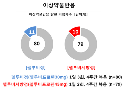 안정성에 대해서는 임상약과 인과관계를 배제할 수 없는 이상약물반응 발현율에 대해 펠루비서방정 투여군은 12.66%(10/79명, 12건), 펠루비정 투여군은 13.75%(11/80명, 13건)로 조사되었고(그림4), 두 군간 이상약물반응 발현율의 통계적 유의성은 없었다. 발생된 이상반응의 종류를 살펴보면, 펠루비서방정 투여군(79명)에서 소화불량이 5.06%(4명), CK증가가 5.06%(4명), 부종이 3.80%(3명), 소양증과 기침이 각 1.27%(1명)로 나타났으며, 펠루비정 투여군(80명)에서는 소화불량이 6.25%(5명)으로 가장 많았고, 변비와 혈중 트리글리세라이드 증가가 2.50%(2명)로 그 뒤를 이었다.