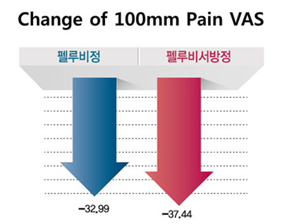 연구 결과, 펠루비서방정 투여군은 임상약 투여 전 대비 투여 28일째 100mm Pain VAS가 평균 37.44 ± 18.65mm 감소하였고, 펠루비정 투여군은 평균 32.99 ± 19.41mm 감소한 것으로 나타났다.