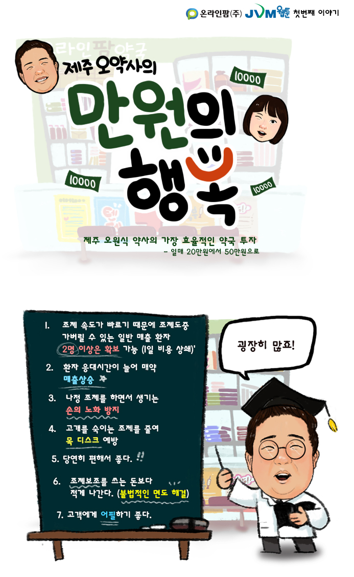 웹툰 제목은 ‘제주 오약사의 만원의 행복’으로 온라인팜 홈페이지(www.online-pharm.co.kr) 및 공식블로그(www.blog.naver.com/on_pharm)등에공개됐다.