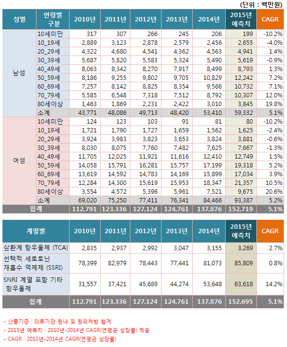 한해 평균 처방액은 1252억원, 연평균 성장률(CAGR)은 5.1%였다. 이를 토대로 2015년도 예상 사용량을 분석한 결과, 1527억원 어치가 처방될 것으로 전망됐다.