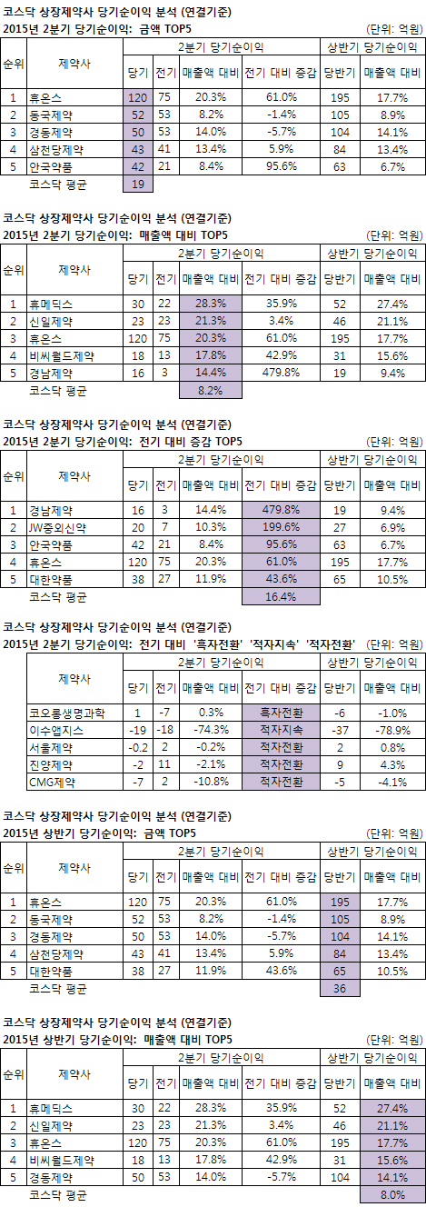코스닥 상장=상반기 당기순이익은 휴온스(195억, 2분기 전기대비 61.0% 증가) 동국제약(105억, 1.4% 감소) 경동제약(104억, 5.7% 감소) 삼천당제약(84억, 5.9% 증가) 대한약품 65억, 43.6% 증가) 순으로 나타났다.(평균 36억)