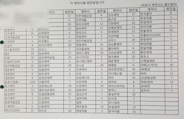 두 곳은 제약사별 리베이트 금액 숫자만 리스트 상하단에 기재했고, 다른 곳은 제약사별 리베이트를 회전기일로 위장 표시했다.