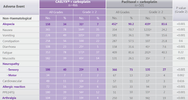 또한 +카보플라틴 병용요법은 파크리탁셀+카보플라틴 병용요법에 비해 탈모, 감각 신경이상 등의 이상 반응 발현비율이 위의 결과처럼 통계적으로 유의하게 적었다.