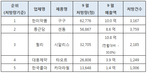 의약품통계데이터인 유비스트에 따르면, 9월 한달간 처방된 시알리스 제네릭의 처방수량은 한미약품 ‘구구’가 6만2,776정, 종근당 ‘센돔’은 5만6,867정, 대웅제약 ‘타오르정’은 2만6,808정, 한국콜마 ‘카마라필’ 1만3,648정으로 집계됐다. 오리지널인 시알리스는 3만2,705정이 처방됐다.
