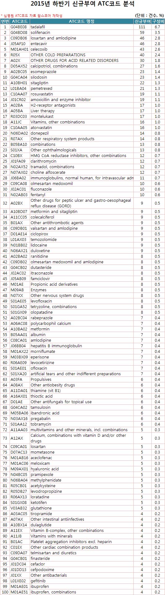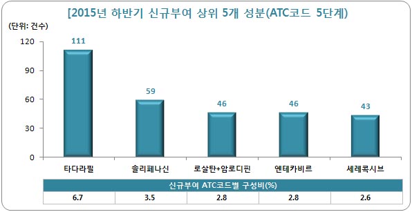 분석결과, 올해 하반기 신규부여 ATC코드는 총 1664건으로, 성분 별로(ATC코드 5단계)는 올해 특허가 풀린 타다라필이 가장 많은 건수를 기록했다. 전체의 6.7%인 111건이 타다라필 성분의 코드였다.