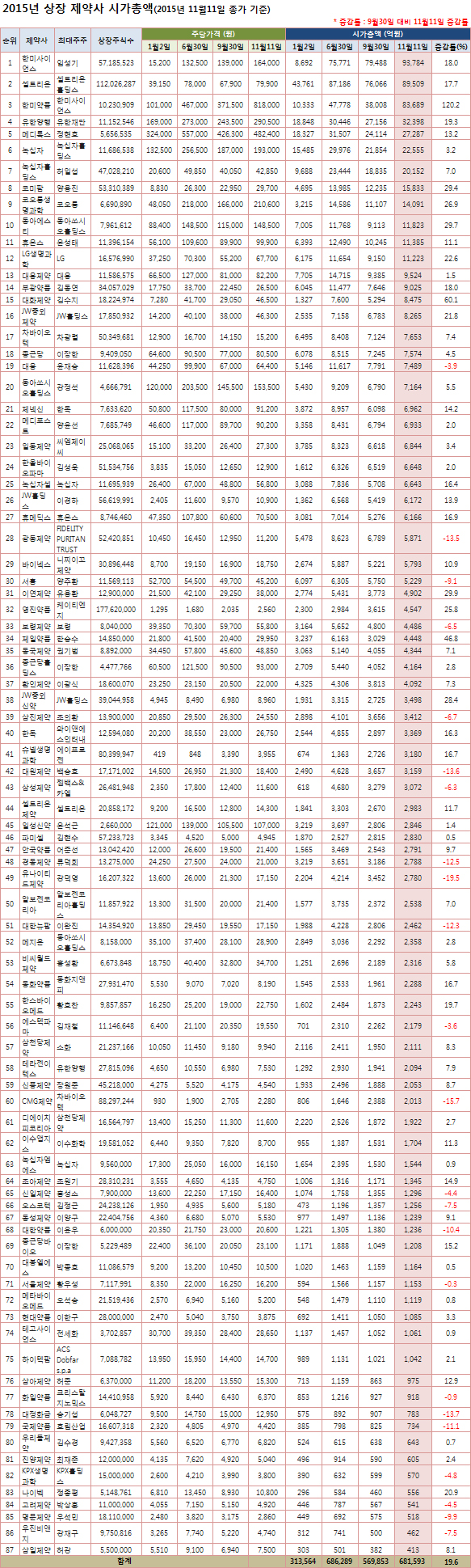 이어 대화제약(60.1%), 제일약품(46.8%), 이연제약(29.9%), 동아에스티(29.7%), 코미팜(29.4%), JW중외신약(28.4%), 코오롱생명과학(26.9%), 영진약품(25.8%), LG생명과학(22.6%) 순으로 시가총액 증가율이 높았다.