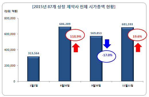 국내 상장 제약사(바이오, 원료의약품, 지주회사 포함) 87곳의 시가총액이 불과 40여일만에 20%(11조1740억원) 가까이 증가해 올해 하반기 하락분을 회복한 것으로 나타났다.