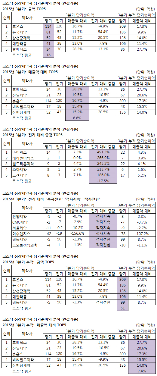△ 코스닥 상장 제약사= 26개 코스닥 제약사의 3분기 순이익은 휴온스(114억) 동국제약 삼천당제약 대한약품 휴메딕스 순으로 나타났다(평균 16억)